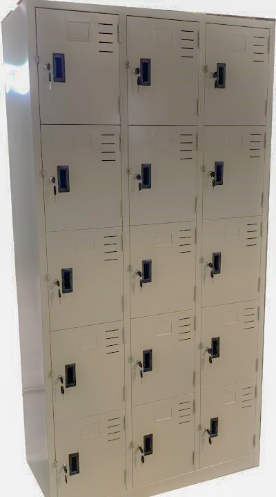ตู้ล็อคเกอร์ แบบ 15 ประตู สำหรับเก็บของพนักงาน มีกุญแจล็อคช่องละ 2 ดอก ป้ายชื่อและช่องระบายอากาศ